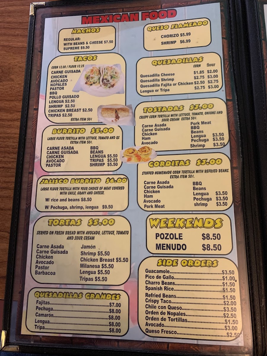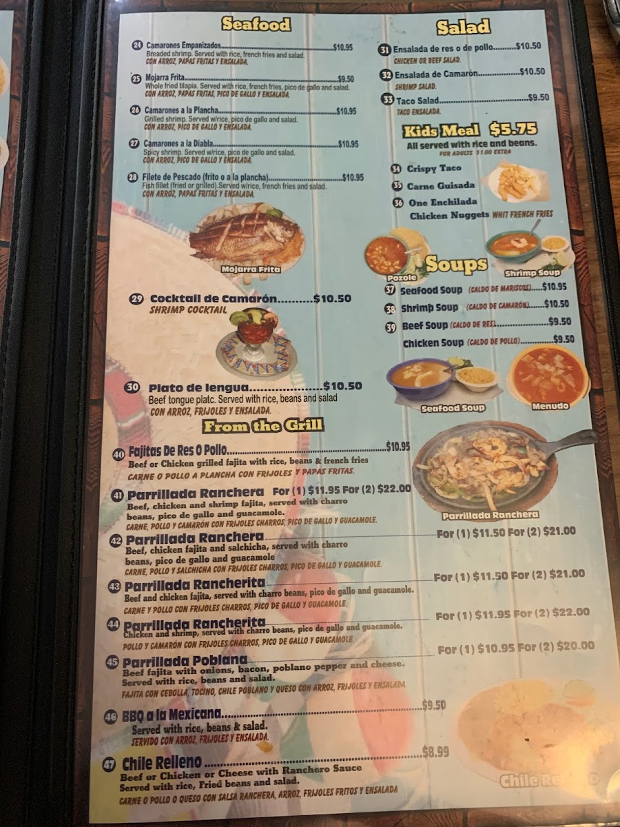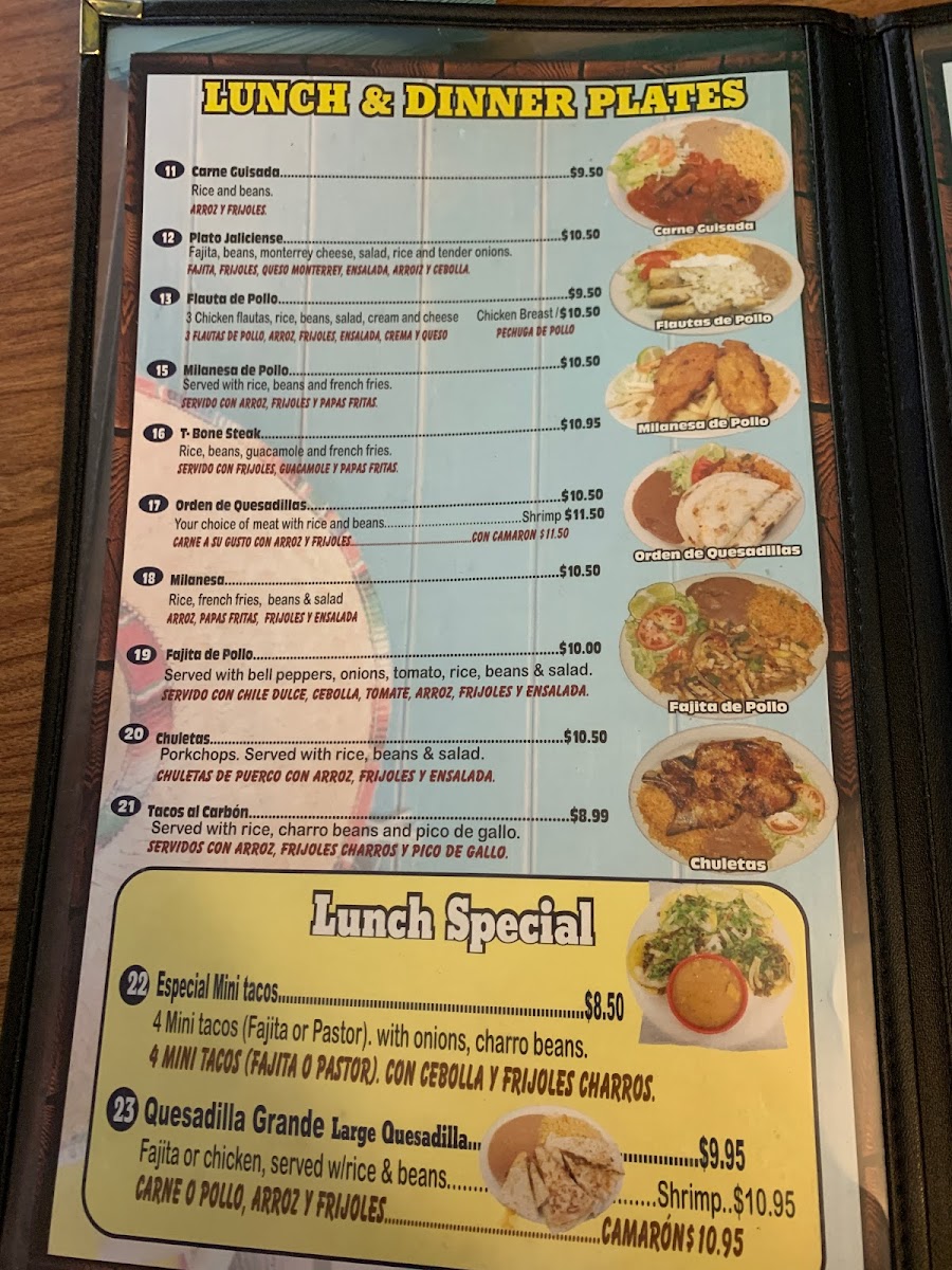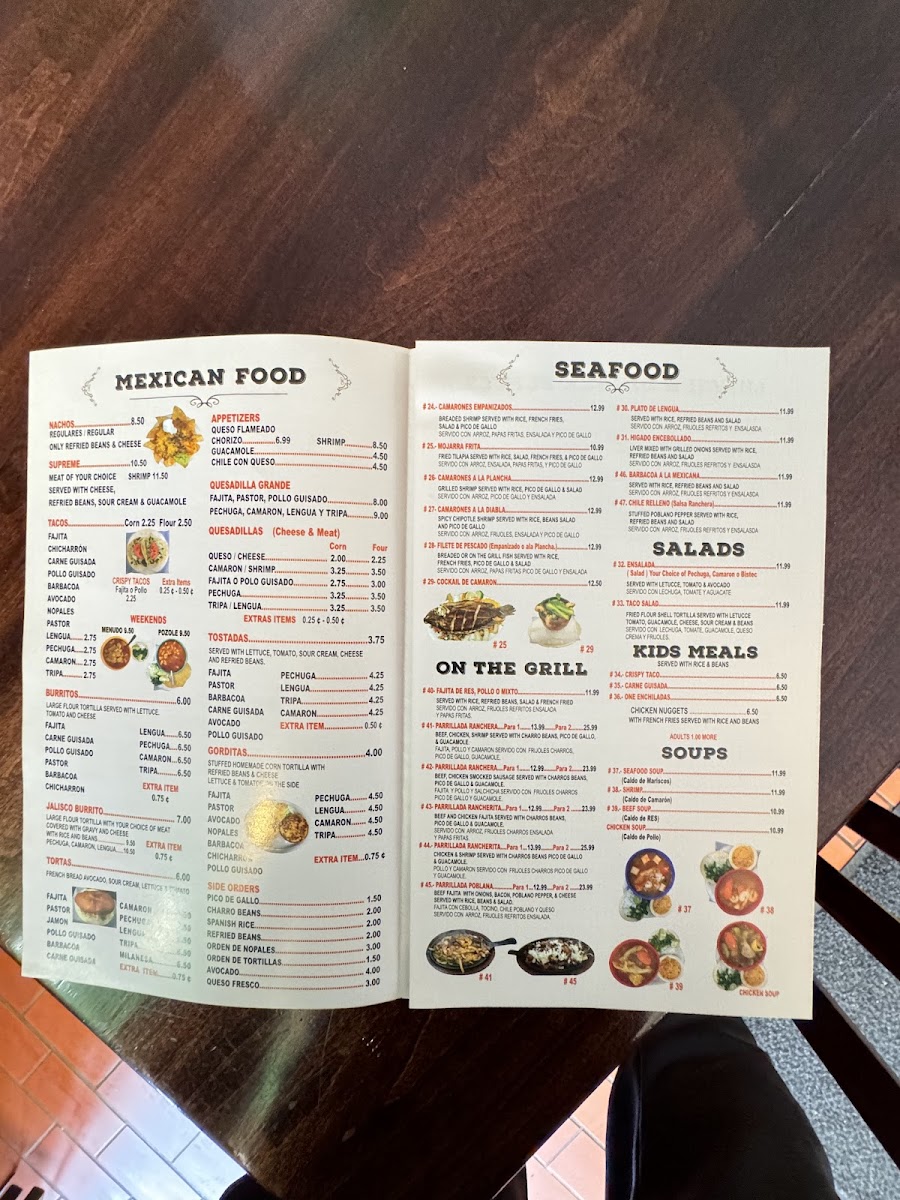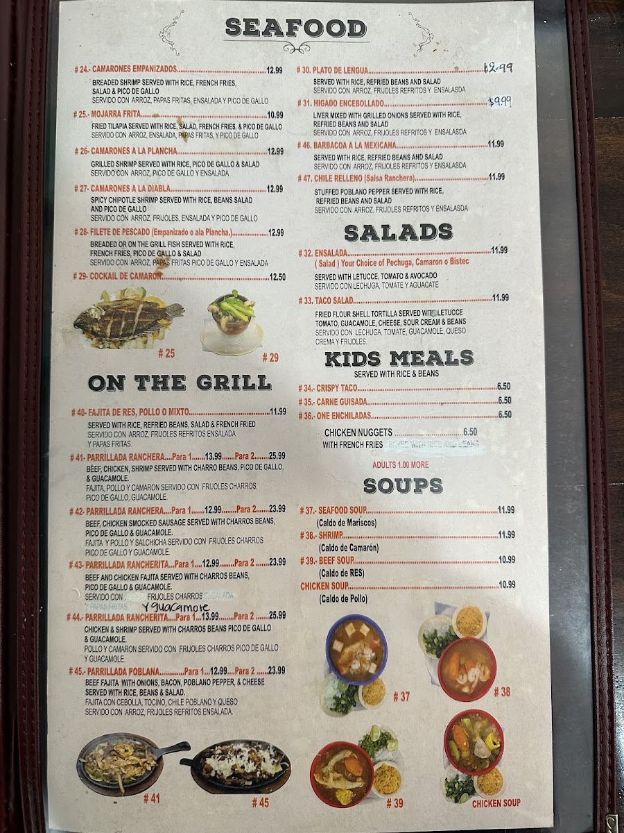 The offerings range from flavorful street tacos and grilled specialties like Tacos Al Carbón to shareable dishes like Shredded Chicken Nachos and Chile Con Queso with Chips and Salsa. These items suit relaxed gatherings or quick, flavorful bites. Fresh sides like guacamole and pico de gallo complement the main dishes, while the variety of options—like eggs with chorizo in the mornings or seafood plates such as Camarones A la Diabla for dinner—showcase the diversity of Mexican cuisine.